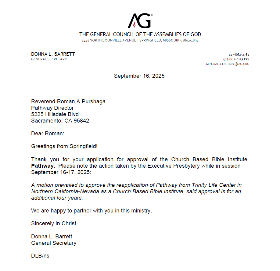 We are approved by the Assemblies of God Executive Presbytery as one of the many approved educational paths available for use by students from any District in the United States, even if they are temporarily living abroad (such as a missionary associate) while studying.